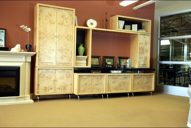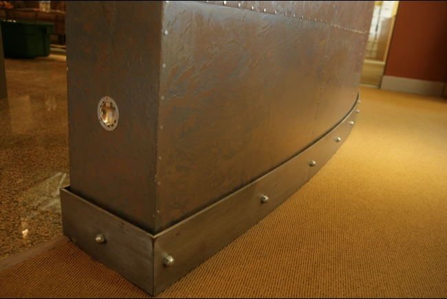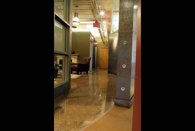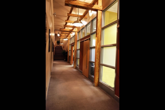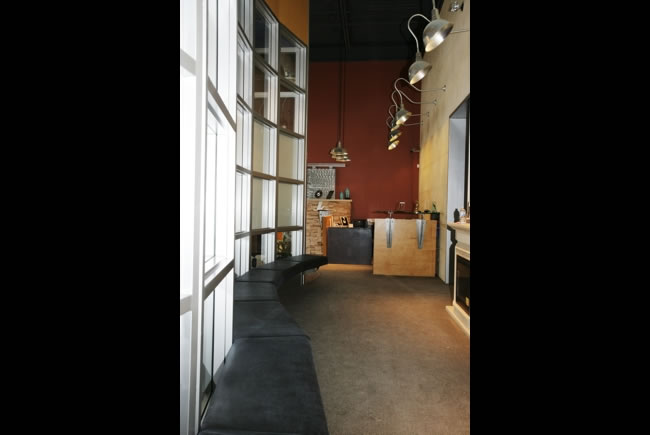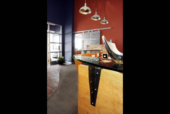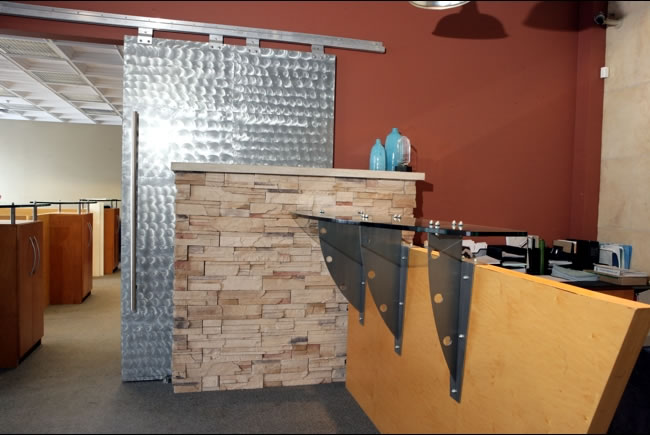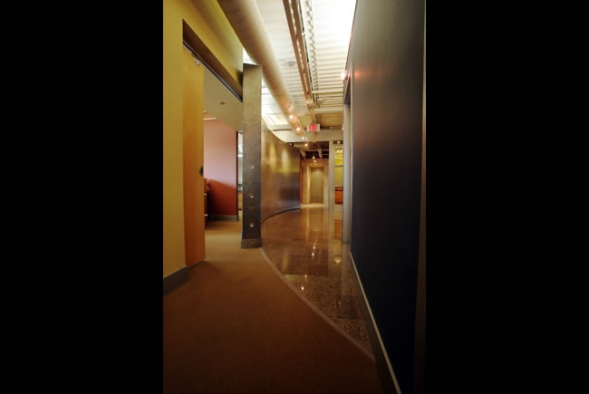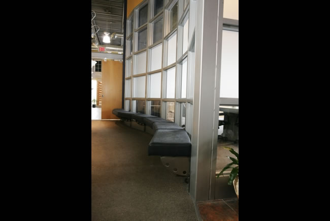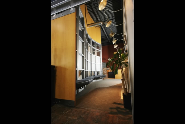 Canamould Corporate Offices The intent of the design was to reflect the many facets of this innovative company with the use of standard construction materials used in unorthodox and playful applications to create an energetic and inviting work environment. Curvilinear walls made of linear metal frames, open storefront-like offices with street lamp posts and canopy, and precision machined millwork and finishes help define this corporate interior and creative work environment. |