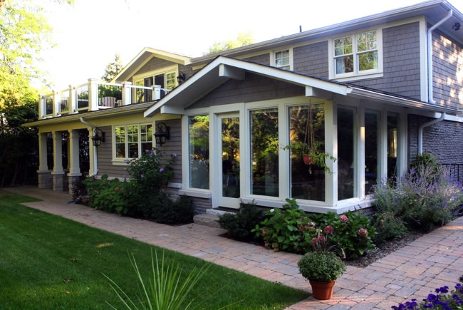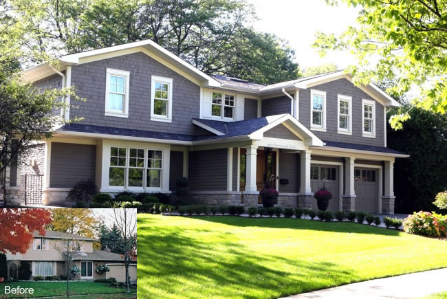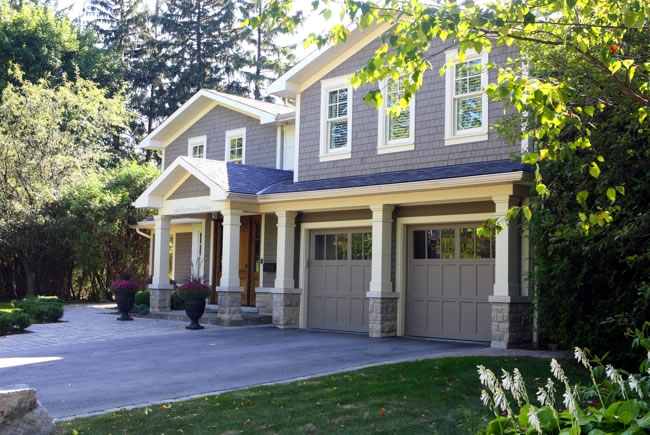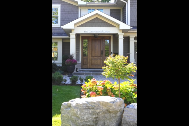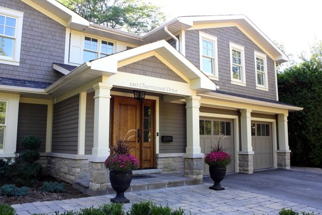 Charnwood A complete interior and exterior overhaul including Master Suite and Kitchen additions completely transformed this tired old 1970’s suburban home into a stunning well-crafted residence in the heart of southeast Oakville. Wood columns and period appropriate detailing characterize the old Oakville cottage aesthetic with stone and wood siding facades. |