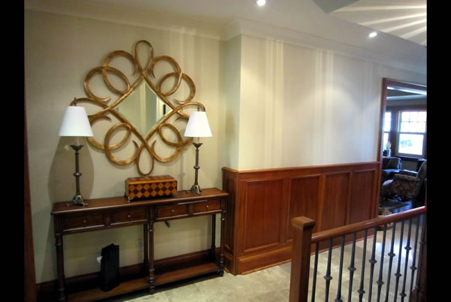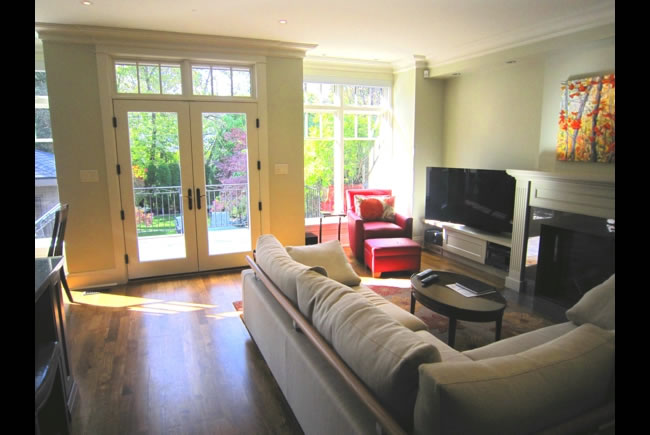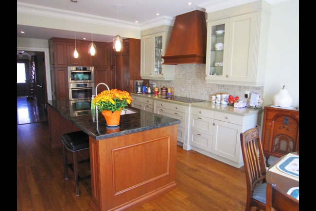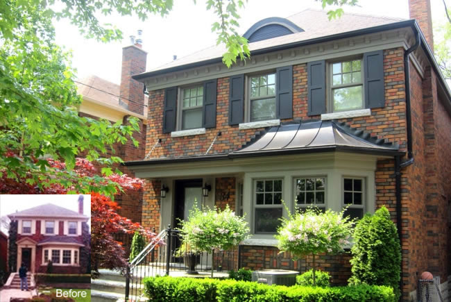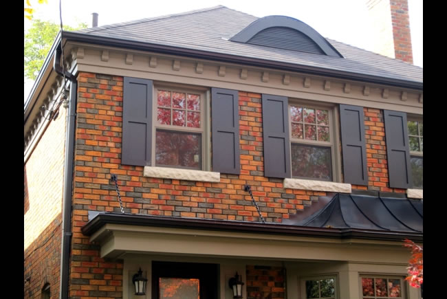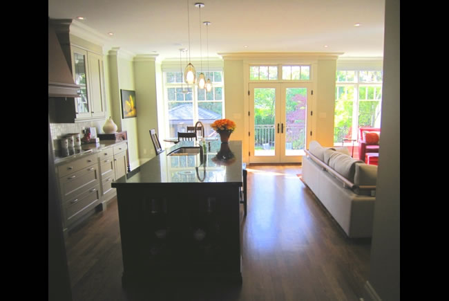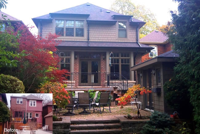 Leaside Renovations and additions to a post-war home on a narrow lot included a two storey rear and side addition which more than doubled the interior living area. The Leaside aesthetic was maintained and further enhanced by the use of authentic period details such as dentil frieze moulding, wood paneled shutters, double hung windows and standing seam metal roof. The interiors respected many of the original wood details such as the gumwood wainscoting and quarter sawn white oak flooring while creating a bright and spacious floor plan. |