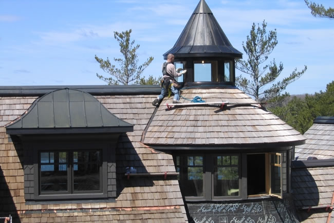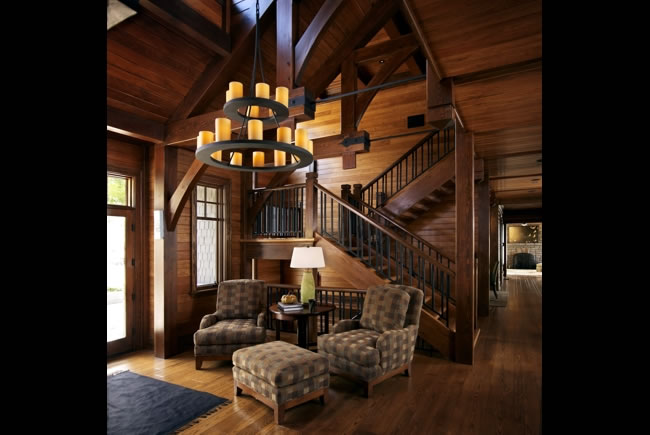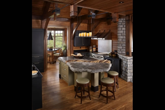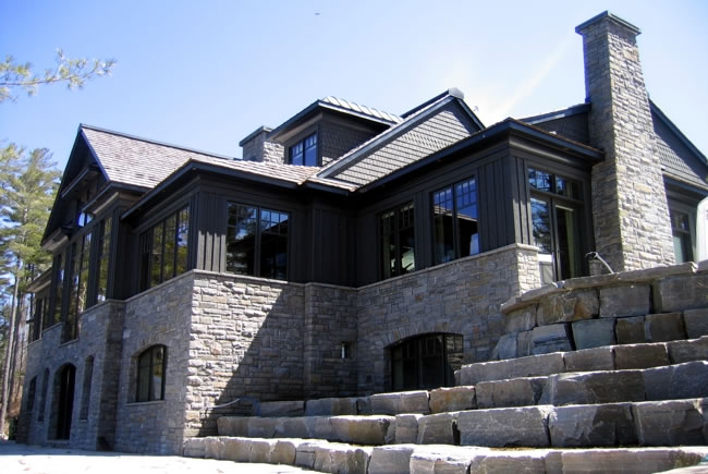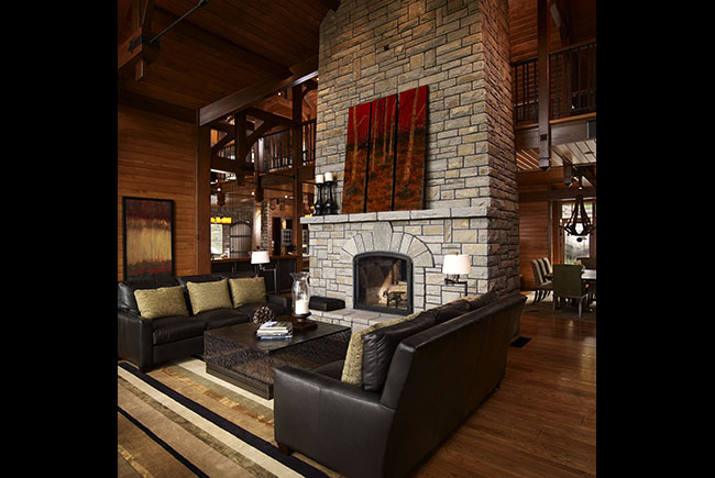 Muskoka Perched high atop Lake Rousseau’s highest point nestled among the trees and set into the side of a rocky slope, this Custom Vacation Residence is well disguised in summer’s full bloom. Crafted from heavy timber and stone blasted from the very hillside, it offers the home owners 360 degree views from the observatory. Natural and rustic finishes characteristic of the Canadian Shield help define the interiors. Interiors by Barnard & Speziale Design Associates. |
